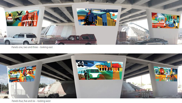 These mosaics use identifiable imagery, abstracted forms and saturated colours expressing the excitement and energy of a community that is part of a world class city. The public art budget was $360,000 and was completed in 2017.