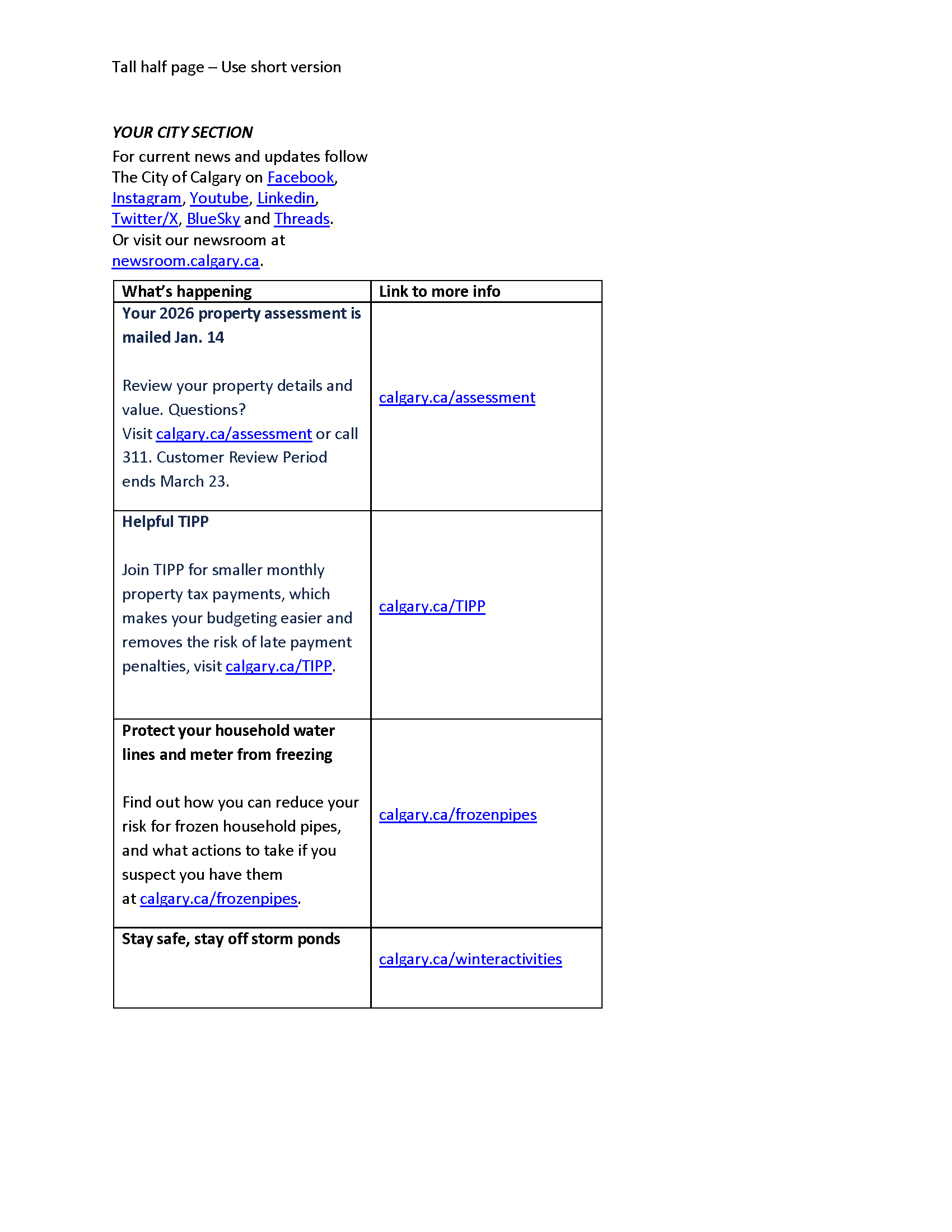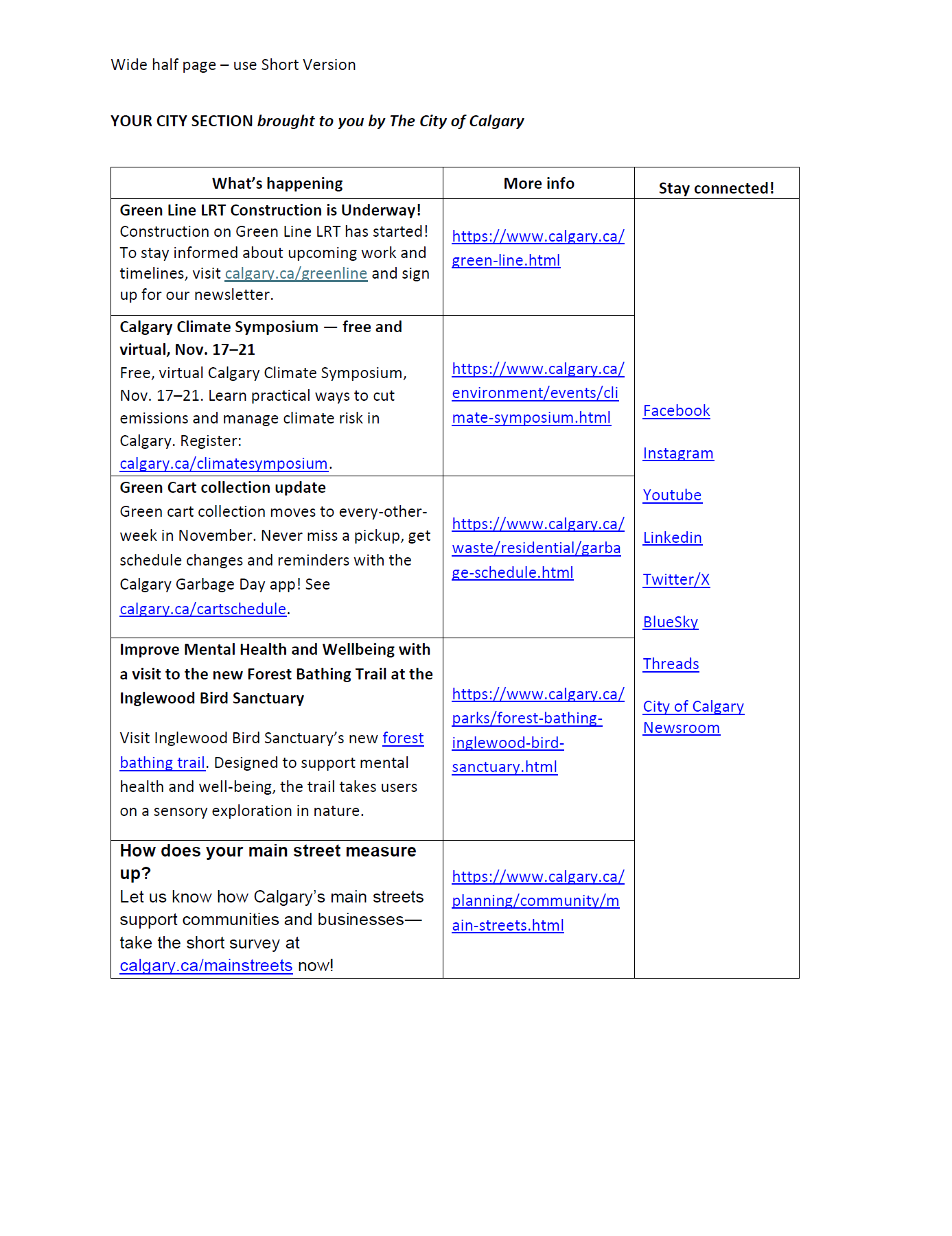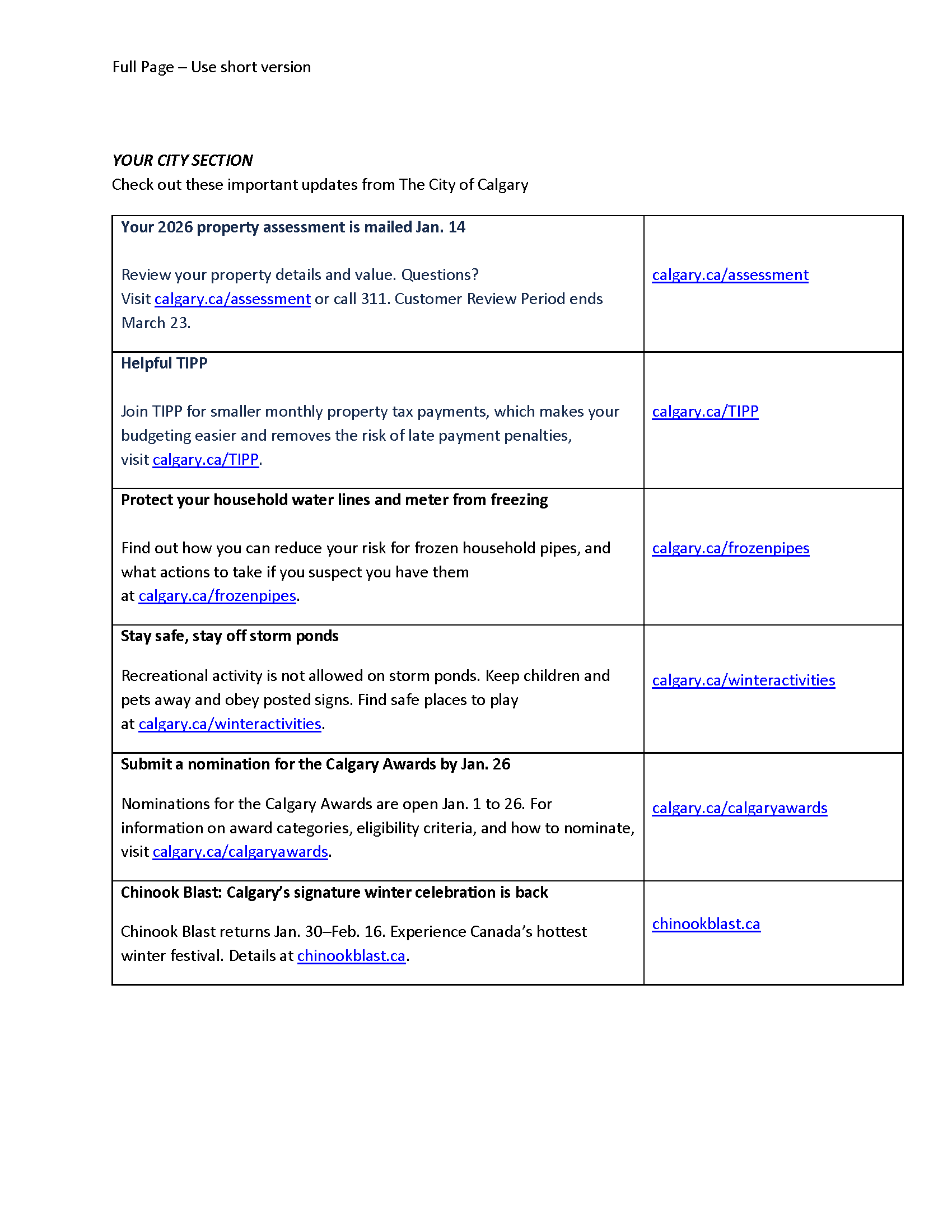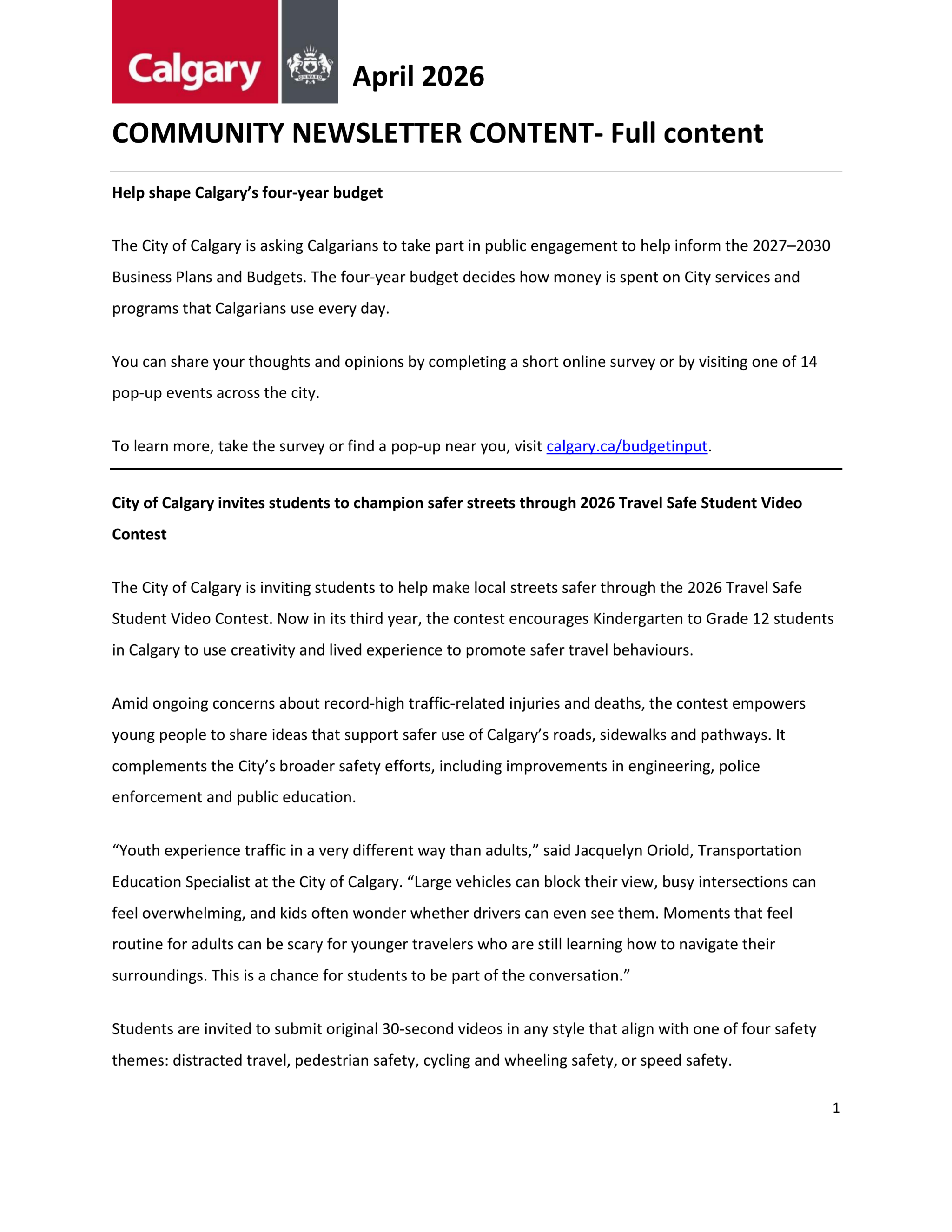 If you have City of Calgary content to add to this page please contact the Customer Service and Communications business unit.