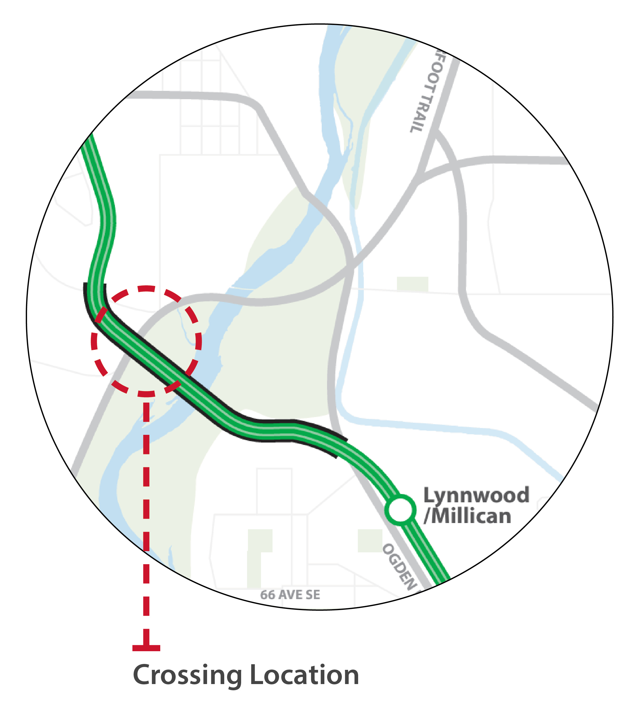 As Green Line moves south through Highfield, it will cross over Deerfoot Trail and the Bow River beside the existing Canadian National Railway tracks. The bridge will take the LRT line across to Refinery Park. Both bridges include multi-use pathways.