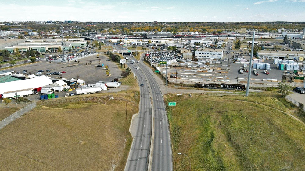 Looking east along Blackfoot Trail. The bridge will span the roadway just behind the green road sign seen in this photo.