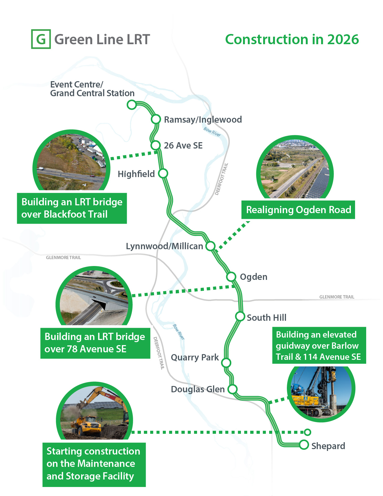 Construction on the Green Line LRT – SE Project began in June 2025 and will ramp up this year. Calgarians will see action mainly in the southernmost part of the route, between Shepard Station and the Bow River crossing (just north of Lynnwood/Millican Station), along with the Blackfoot Trail LRT Bridge project near Crossroads Market.