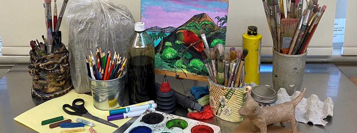 Students will experience a wide variety of artist mediums. Our studio is equipped with easels, tables and chairs so you can work comfortably seated or standing. We have drying shelves and studio storage for your work.