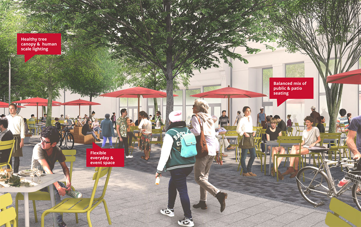 Events supplement this everyday activity with seasonal, temporary activations that bring a new experience to the public realm - from art to performance and beyond. Within the central program zone, the public realm offers a platform for this mix of everyday and special activity, activated via public seating, patios, social gatherings, busking, street vendors and more.