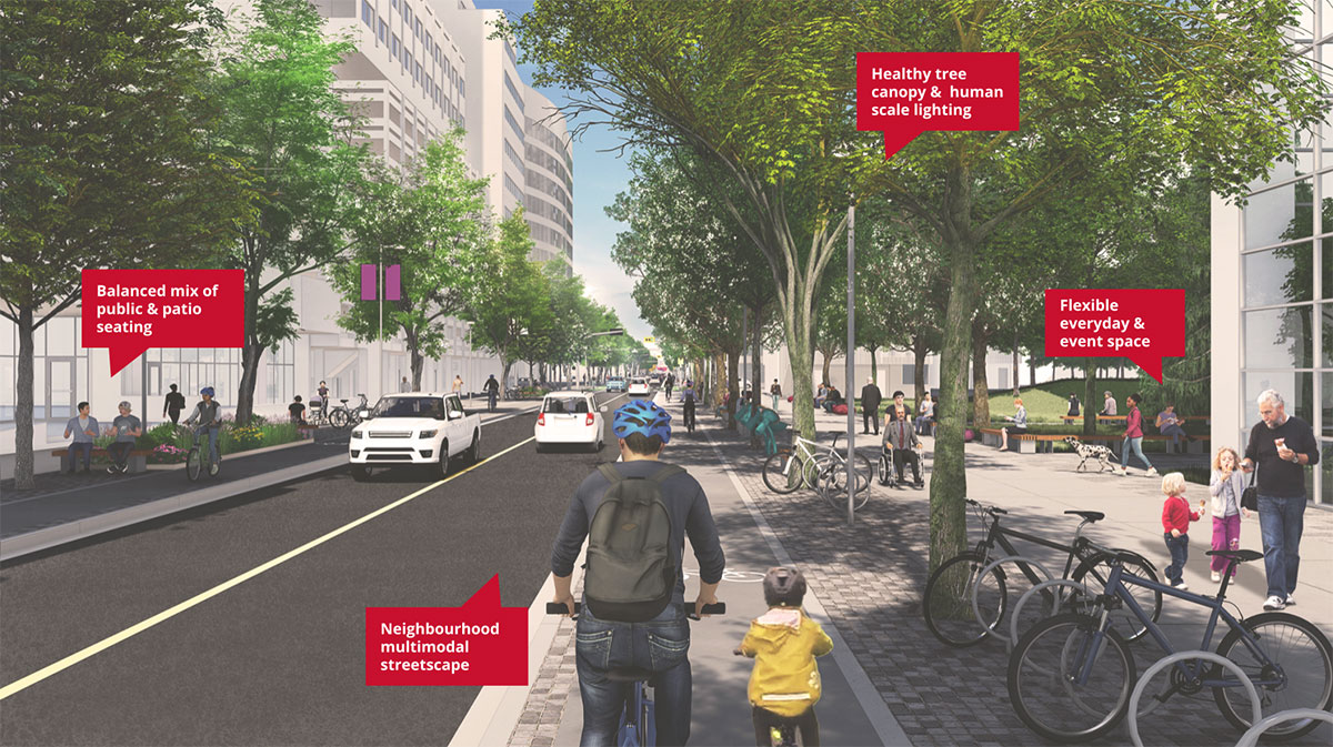 The multimodal street provides a neighbourhood-scale streetscape where two-way vehicular traffic is complemented by a people-focused public realm. Consistent, unobstructed sidewalks are provided on each side of the street, separated from bike/wheeling lane by furnishing zone.
