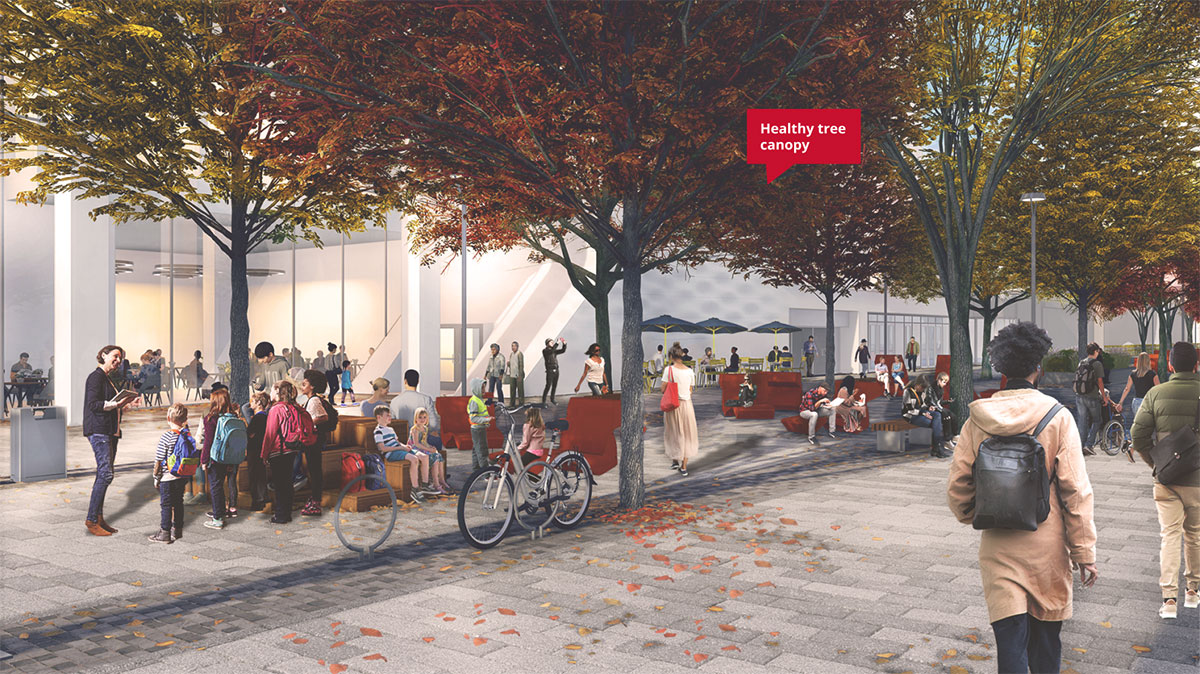 Street greening, with low planting beds complementing the mix of large trees, further enhances the seasonality, giving character to the streetscape, improves stormwater runoff and promotes biodiversity.