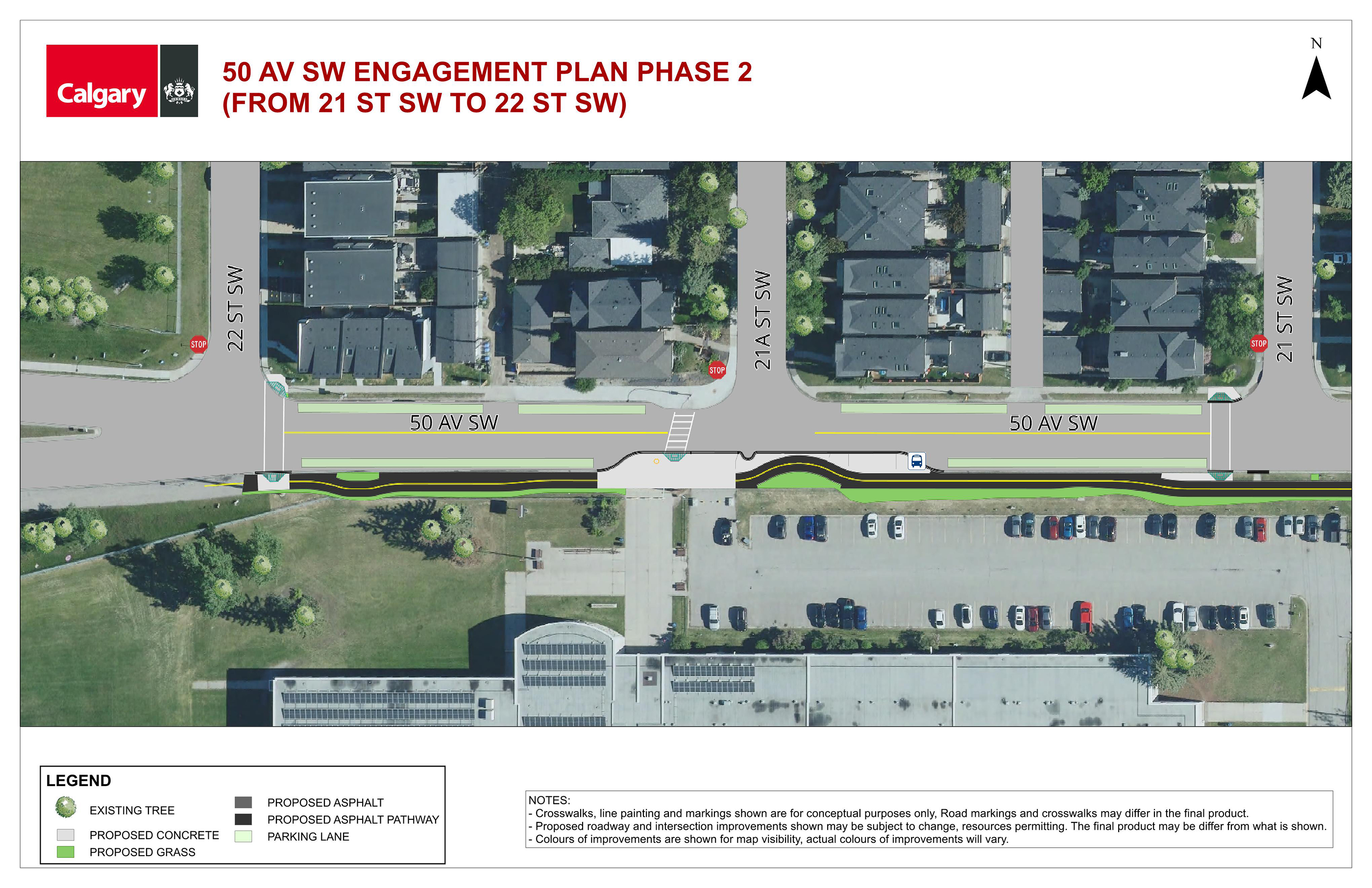 This phase includes a new signal light at 20 Street S.W., extending the multiuse pathway along the southside of 50 Avenue from 19 Street to connect with the existing pathway at 22 Street and replacing the pavement on 50 Avenue between Crowchild Trail and 14a Street.