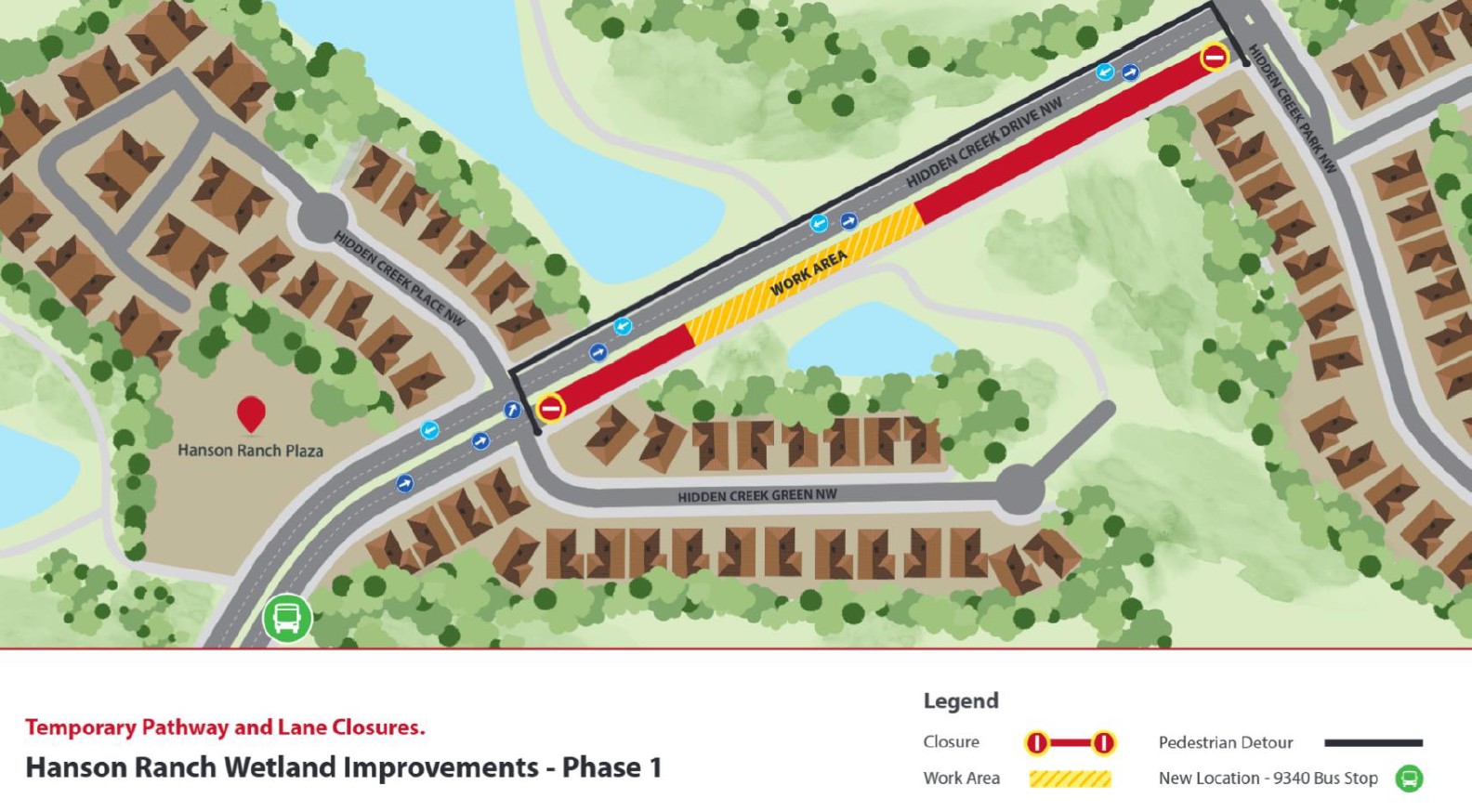 The contractor is currently developing a traffic management plan(s) which will aim to minimize disruption to the public while balancing the need for efficient project execution. We will be maintaining two-way traffic on Hidden Creek Drive. Information related to impacts will be shared with the community prior to construction during the third phase of our engagement process and will continue during construction.