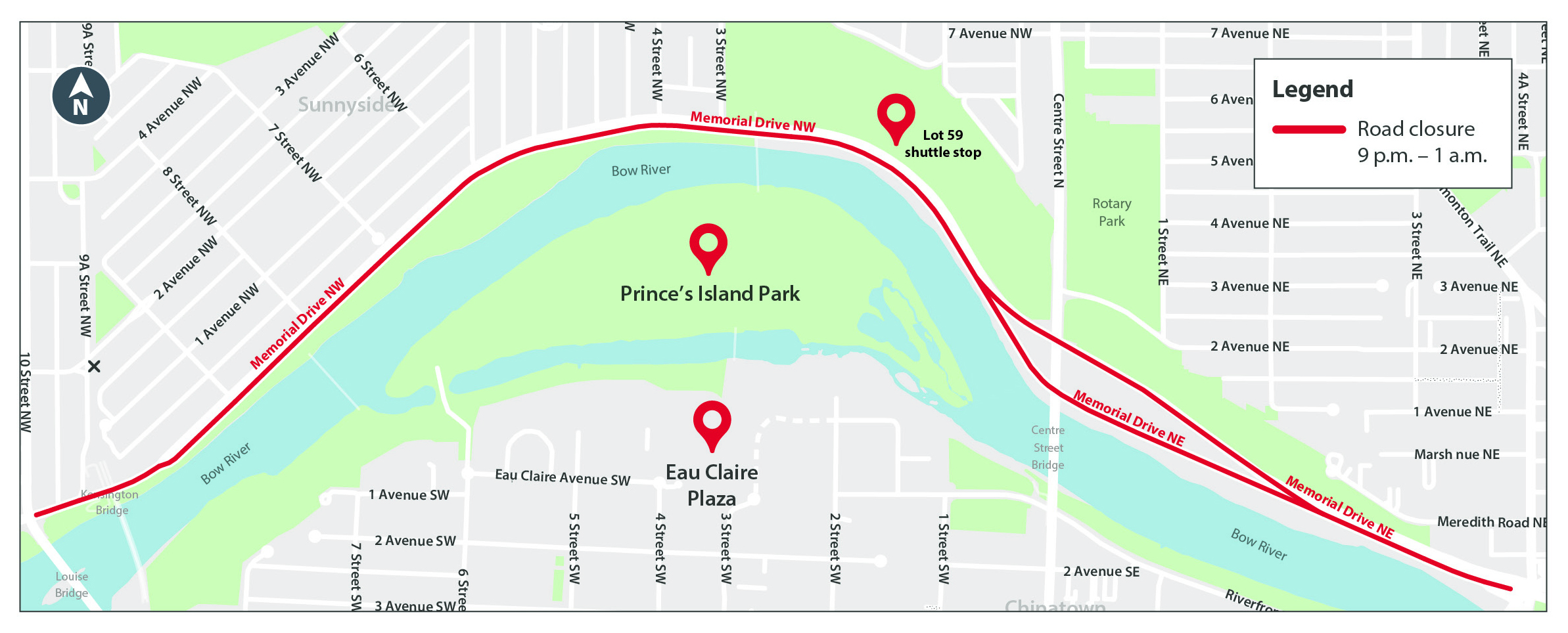 - Closed in both directions (eastbound and westbound) from 10 Street N.W. to 4 Street N.E.