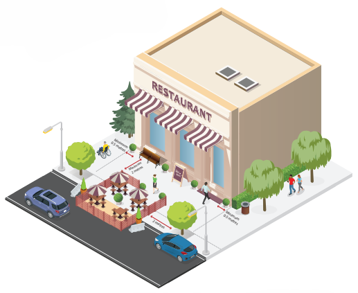 - Curbside patios must maintain a minimum of 2 metres of clearance from other adjacent patios, if extending beyond two parking spaces (beyond approximately 12 metres).