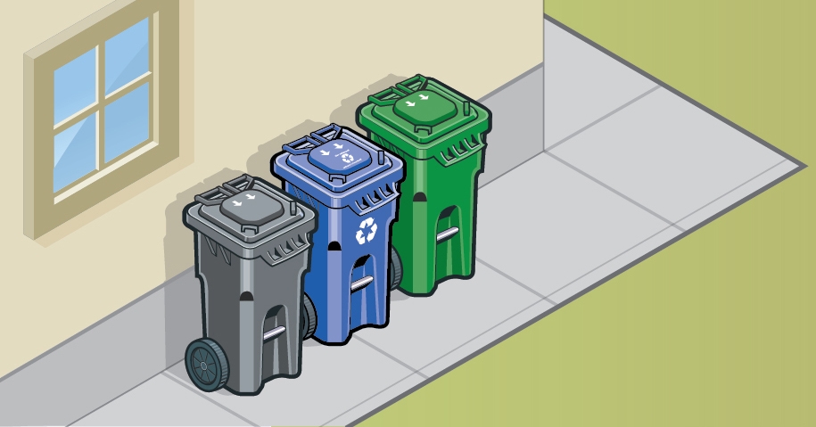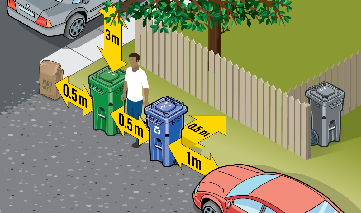 Blue and green carts are picked up on the same day of the week. Ensure adequate spacing between carts, extra yard waste bags and other obstacles.