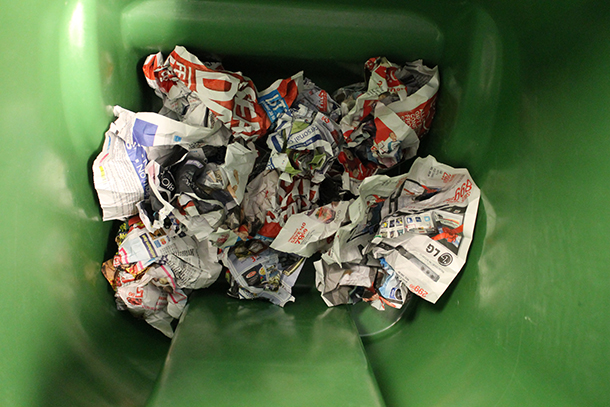 - Crumple up flyer sheets into balls and put them in the bottom of your green cart before putting in any food or yard waste. You can also use newspaper, paper bags, or soiled pizza boxes.