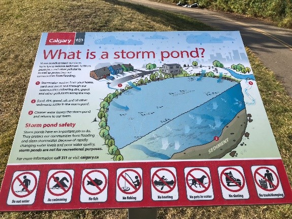 All storm ponds have identifying signage. If you’re not sure if you’re at a storm pond, look for signs like these: